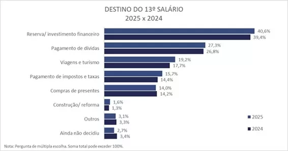 De acordo com o levantamento, 40,6% dos empregados com carteira assinada no estado planejam aplicar ou investir o montante, percentual ligeiramente superior aos 39,4% observados em 2024, mantendo essa opção como o principal destino do valor.