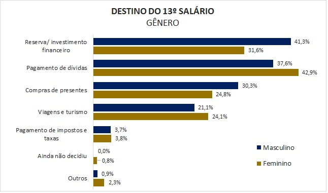 A sondagem mostra também que as mulheres vão utilizar o 13º salário principalmente para o pagamento de dívidas, com 42,9%, e depois para fazer uma reserva ou investimento financeiro, com 31,6%. Já entre os homens, a principal destinação será a poupança ou investimento, com 41,3%, e na sequência a quitação de dívidas, com 37,6%.