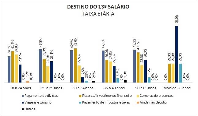 As pessoas na faixa de 35 a 49 anos vão usar o 13º salário para quitar suas dívidas, com 42,2%, bem como quem tem entre 50 e 65 anos, com 43,3%. E o pessoal da terceira idade vai aproveitar o dinheiro para viajar, com 75%.