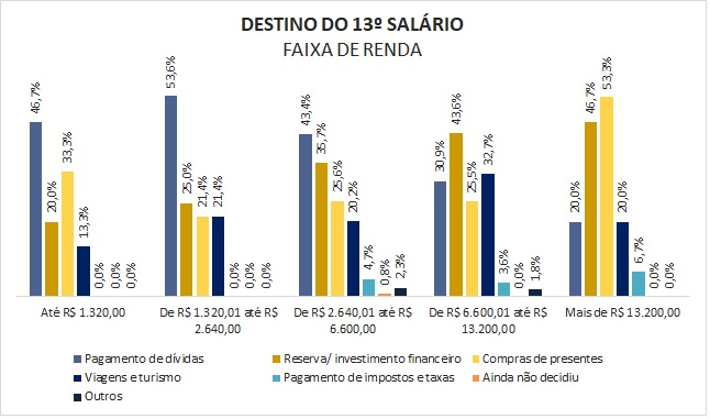 Os paranaenses que recebem até cinco salários mínimos utilizarão o 13º salário principalmente para o pagamento de dívidas. Os que têm renda entre R$ 6.600,01 e R$ 13,2 mil pretendem usar o abono para fazer uma reserva ou investimento, com 43,6%. E os que ganham mais de R$ 13,2 mil utilizarão o dinheiro para a compra de presentes.
