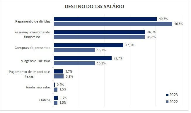 Outro destino será fazer um reserva ou investimento financeiro, para 36% dos paranaenses. Os que vão usar o dinheiro para a compra de presentes correspondem a 27,3%, parcela bastante superior aos 16,2% que utilizariam o 13º salário para compras em 2022. Há quem utilizará o valor para viajar, com 22,7% de citações, o maior percentual da série histórica da sondagem para essa destinação.