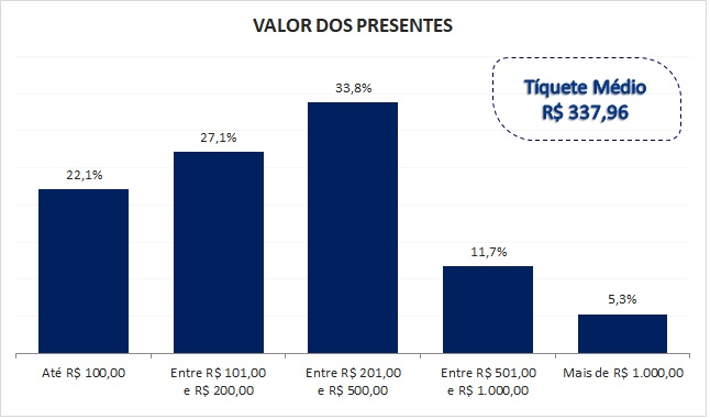 Com um tíquete médio de R$ 337,96, os gastos dos paranaenses devem ser 4,8% maiores esse ano. Em 2022, a média de gastos com presentes foi de R$ 322,36. Grande parte dos consumidores (33,8%) vai gastar entre R$ 201 e R$ 500 na compra dos presentes; 27,1% vão dispender entre R$ 101 e R$ 200 e 22,1% pretendem gastar somente até R$ 100. Os que planejam investir um pouco mais, entre R$ 501,00 e R$ 1 mil somam 11,7% e 5,3% vão gastar mais de R$ 1 mil em presentes.