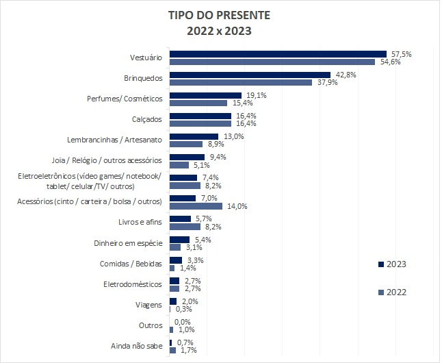 Entre as principais alternativas de presentes, itens de vestuário serão os mais escolhidos, com 57,5%. Os brinquedos devem corresponder a 42,8% das preferências. Perfumes e cosméticos serão opções de presentes para 19,1%, bem como calçados (16,4%), lembrancinhas e artesanato (13%) e joias, relógios e acessórios (9,4%).