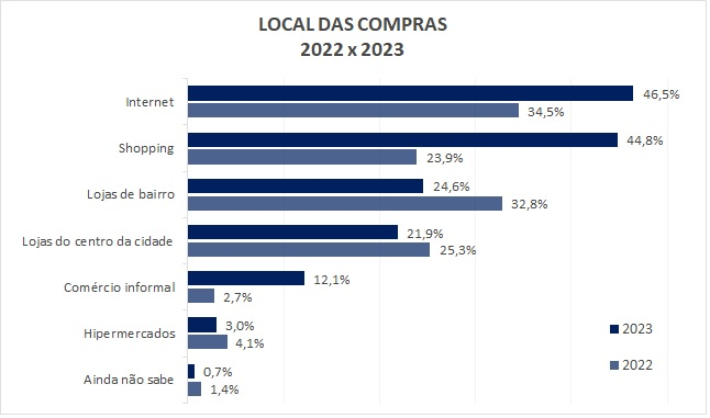 O comércio de rua e a internet serão os principais locais de compra, com 46,5% de citações cada. As lojas de shopping também receberão grande movimento este ano, com 44,8%, sendo que no ano passado receberam 23,9% do volume de compras.
