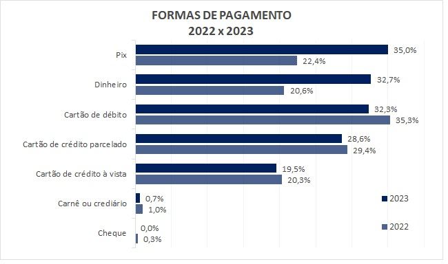 O pagamento à vista será a modalidade preferida para 67,2% dos consumidores do estado, somando as modalidades pix, dinheiro e cartão de débito. As compras parceladas ou no vencimento do cartão de crédito corresponderão a 32,8%.