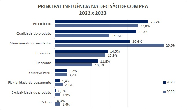 Neste ano, o preço baixo será um dos fatores mais importantes na decisão de compra, com 25,7%, seguido pela qualidade do produto, com 22,3%, e pelo atendimento do vendedor, com 20,6%.