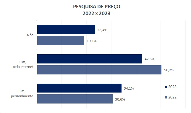 Os paranaenses gostam de pesquisar preços antes de fazer suas compras de Natal e 76,6% fazem pesquisas prévias. Neste ano, cresceu a parcela que fará análise de preços pessoalmente, com 34,1%, ante 30,6% em 2022. A pesquisa de preço pela internet caiu em relação ao ano passado, saindo de 50,3% para 42,5%.