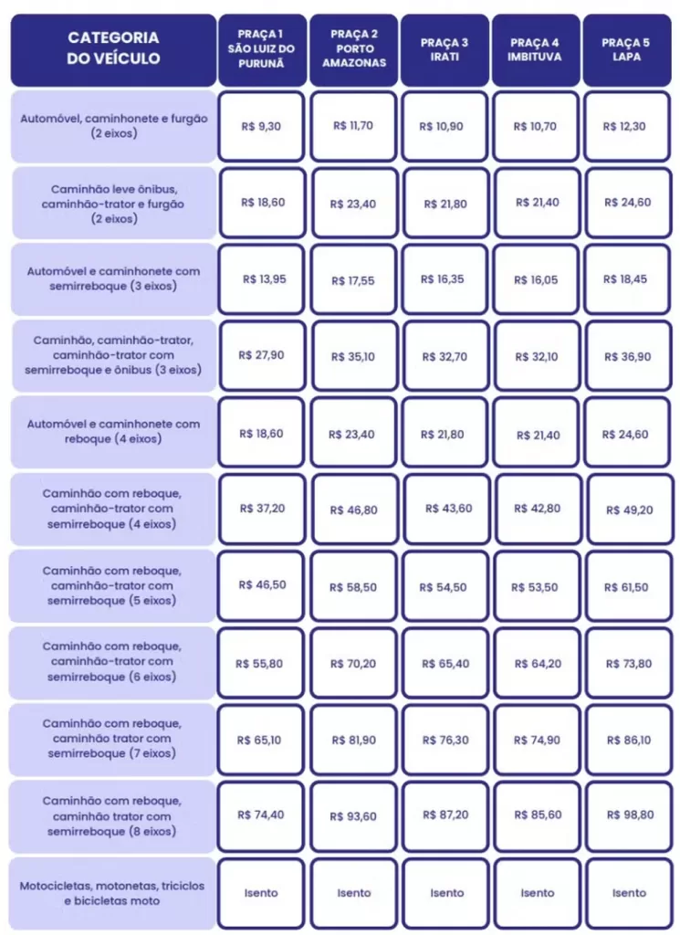 No dia 28 de agosto, as tarifas de pedágio também ficarão mais caras nas praças do lote 2, que ficam nas regiões norte, Campos Gerais, Região Metropolitana de Curitiba e litoral, e são operadas pela EPR Litoral Pioneiro.
