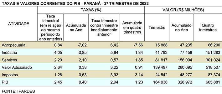 O PIB do Paraná no segundo trimestre de 2022 totalizou R$ 164,04 bilhões, sendo R$ 139,50 bilhões referentes ao valor adicionado a preços básicos e R$ 24,54 bilhões de impostos. Os dados mostram que o Estado está acima do índice pré-pandemia (primeiro trimestre de 2020), uma recuperação de 2,32% na economia.