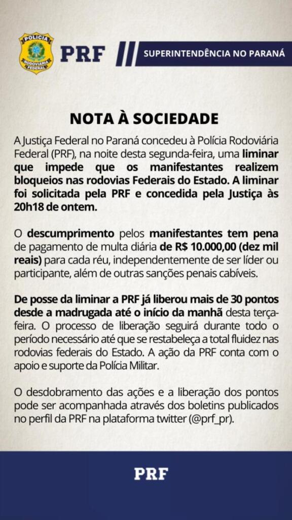 “A Justiça Federal do Paraná concedeu à polícia Rodoviária Federal (PRF), na noite de segunda-feira, uma liminar que impede que os manifestantes realizem bloqueios nas rodovias federais do Estado. A liminar foi solicitada pela PRF e concedida pela Justiça às 20h18 de ontem”, consta na nota.