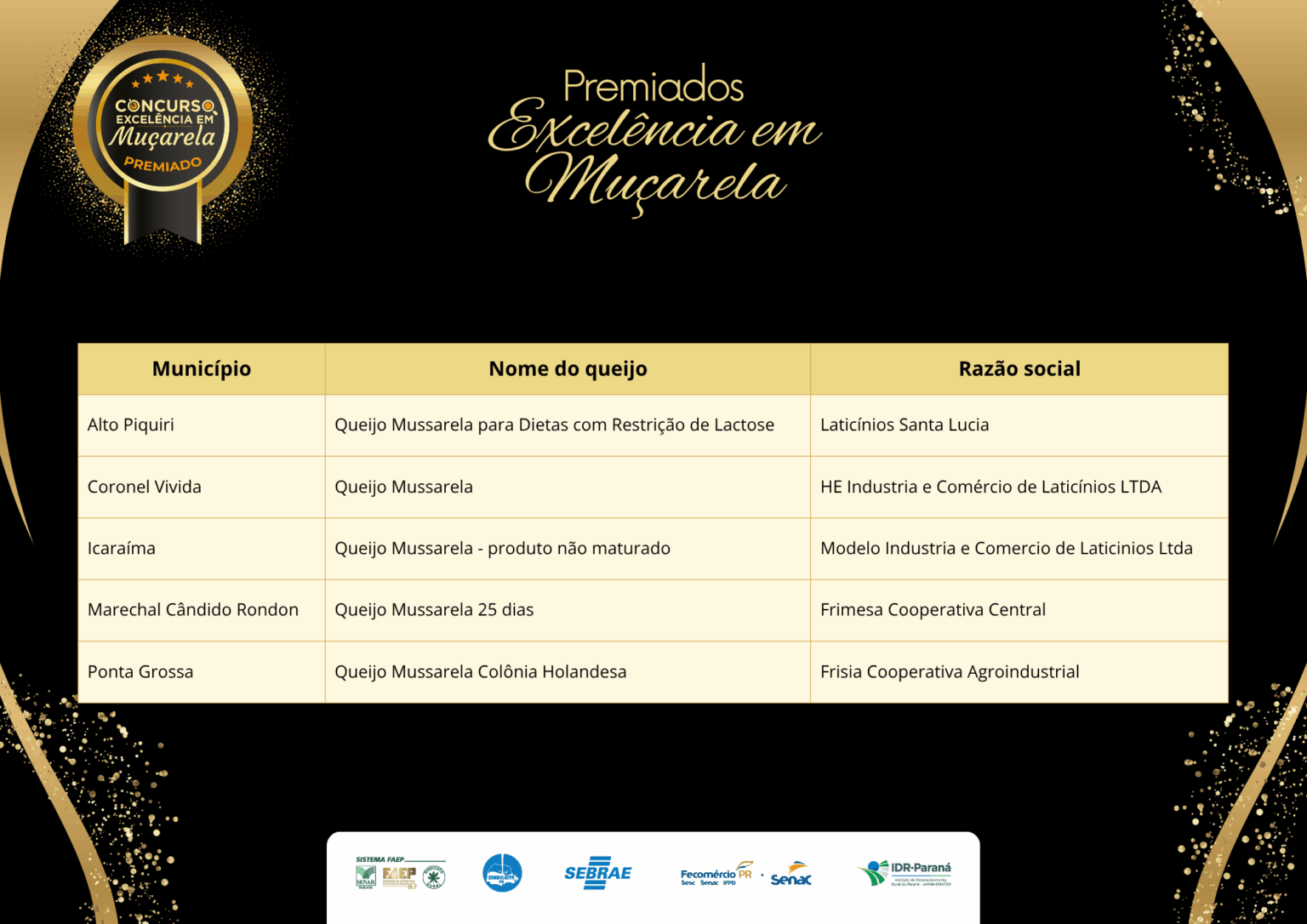 O queijo Parmesão Gold, produzido pela Frimesa Cooperativa Central, de Marechal Cândido Rondon, recebeu a maior pontuação dos jurados, sagrando-se o melhor produto do Prêmio Queijos do Paraná. Além disso, esta edição trouxe como novidade o Concurso Excelência em Muçarela – Edição Pizza, que elegeu os cinco melhores produtos para esta aplicação gastronômica.