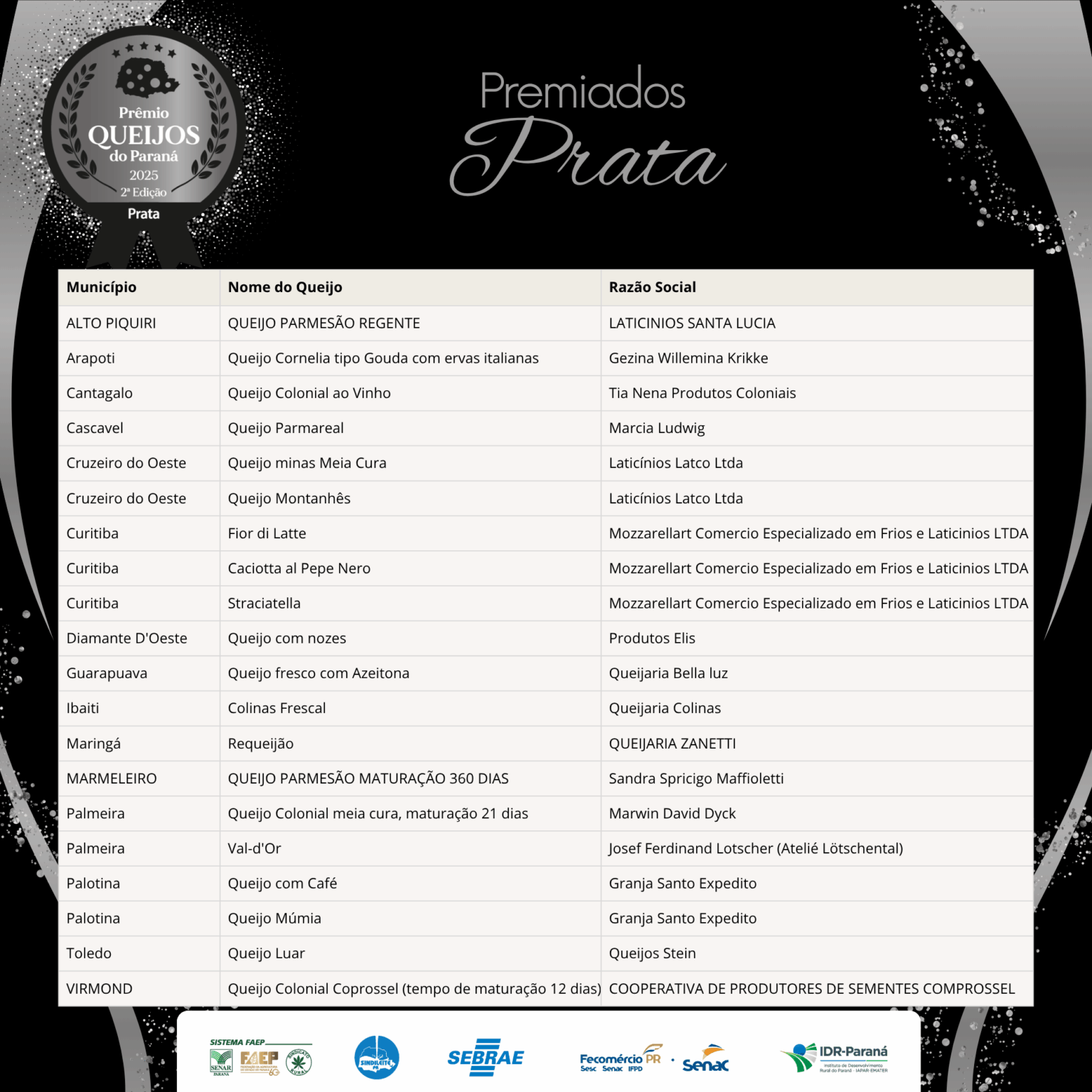 “O Prêmio Queijos do Paraná é mais do que uma competição. É um movimento de valorização da cadeia produtiva dos lácteos paranaenses, que aproxima os produtores da excelência, dos consumidores e dos mercados”, disse Meneguette. “E, é claro, deixo meus parabéns aos vencedores! Que esse reconhecimento seja mais um incentivo para continuar inovando, aprendendo e levando o nome do Paraná cada vez mais longe”, concluiu.