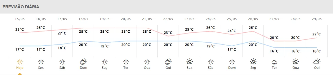 Foz do Iguaçu: mínima de 16°C e máxima de 28°C, com sol brilhante.