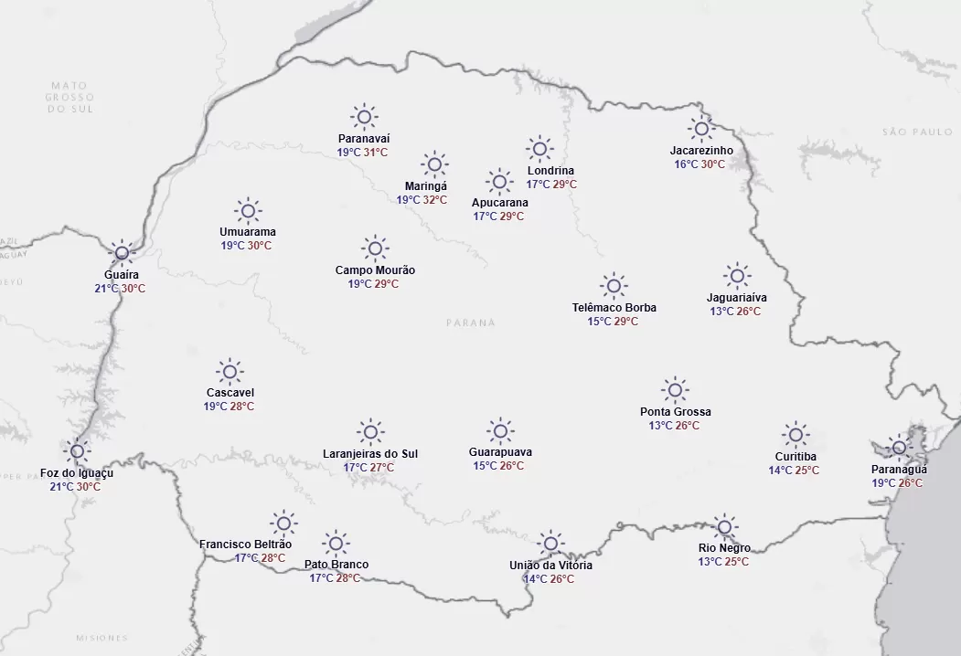 Ao longo do dia, o sol predomina e as temperaturas sobem rapidamente, se aproximando dos 30°C em grande parte do Paraná. Os maiores índices devem ser registrados no Oeste e no Noroeste.