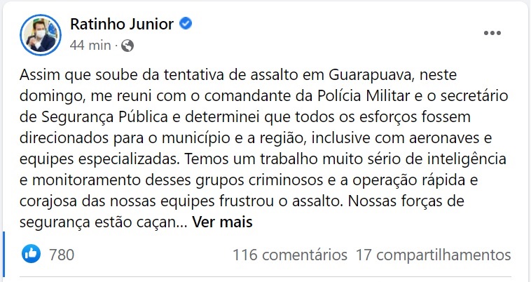 “Assim que soube da tentativa de assalto em Guarapuava, neste domingo, me reuni com o comandante da Polícia Militar e o secretário de Segurança Pública e determinei que todos os esforços fossem direcionados para o município e a região, inclusive com aeronaves e equipes especializadas. Temos um trabalho muito sério de inteligência e monitoramento desses grupos criminosos e a operação rápida e corajosa das nossas equipes frustrou o assalto. Nossas forças de segurança estão caçando esses bandidos para dar uma pronta resposta à população.”