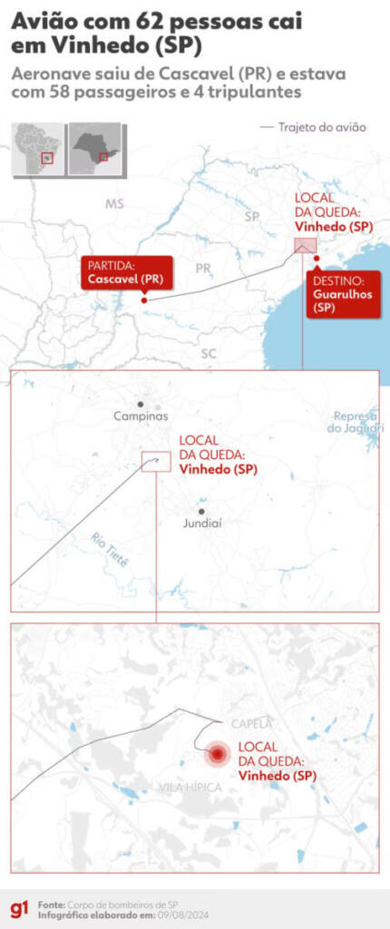 A queda foi na tarde desta sexta-feira (9). A aeronave tinha como destino Guarulhos, em São Paulo. Estavam a bordo 57 passageiros e 4 tripulantes, segundo a Voepass Linhas Aéreas, antiga Passaredo, companhia aérea dona da aeronave. Ninguém sobreviveu.