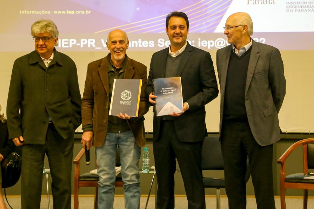 O governador Ratinho Junior recebeu nesta segunda-feira (29), em Curitiba, sugestões de propostas de Estado para o Paraná, elaboradas conjuntamente pelos mais de 500 associados do Instituto de Engenharia do Paraná (IEP) e do Movimento Pró Paraná. São 26 segmentos que abordam áreas como infraestrutura, energia elétrica, meio-ambiente, ciência e tecnologia, educação e eficiência da máquina pública, entre outros.