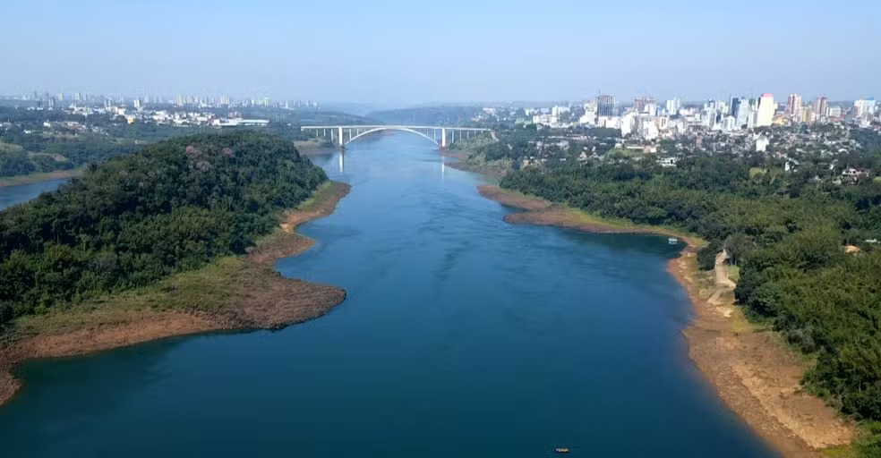 O Rio Paraná está com nível de cinco a oito metros abaixo no normal deixando à mostra parte das margens e pedras, no trecho próximo a Ponte Internacional da Amizade, entre Foz do Iguaçu e Cidade do Leste, no Paraguai, segundo Itaipu Binacional.