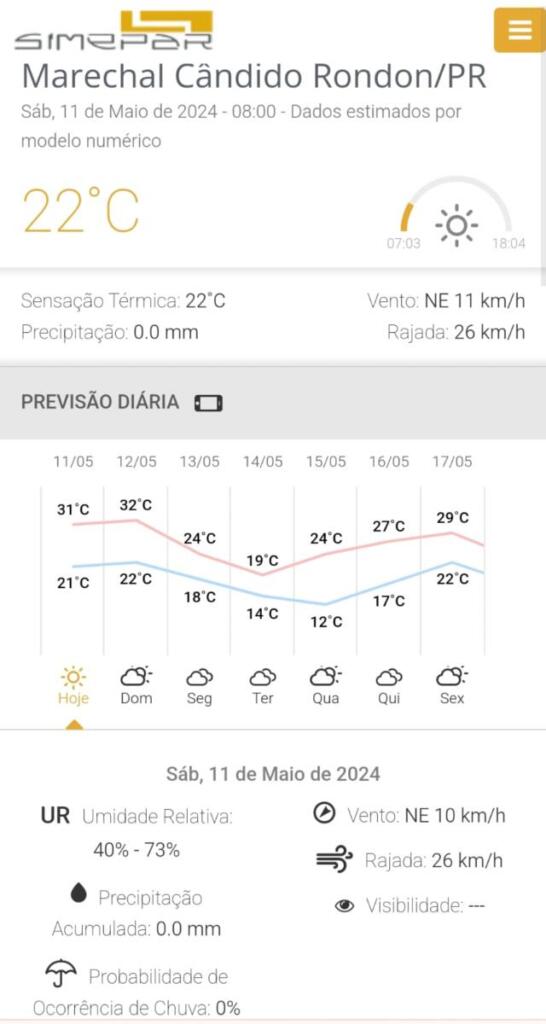 Em Marechal Cândido Rondon não há previsão de chuva para este sábado. A temperatura máxima deve alcançar 31ºC. Confira abaixo a previsão do tempo para os próximos dias.