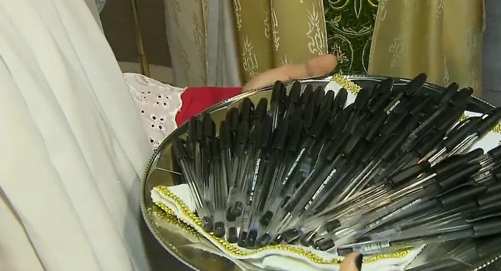 Os fiéis levaram as suas próprias canetas para a benção e também foram distribuídas canetas de tinta preta e de tubo transparente – permitida no dia da prova.