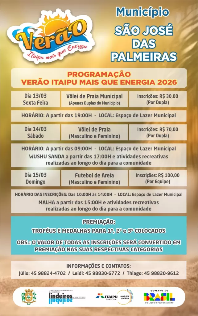 O Verão Itaipu Mais que Energia passará por mais um município no final de semana dos dias 14 e 15 de março. São José das Palmeiras sedia o evento. Os organizadores decidiram iniciar as atividades a partir de sexta-feira (13). Com isso, o Verão Itaipu Mais que Energia chega a 10 municípios.