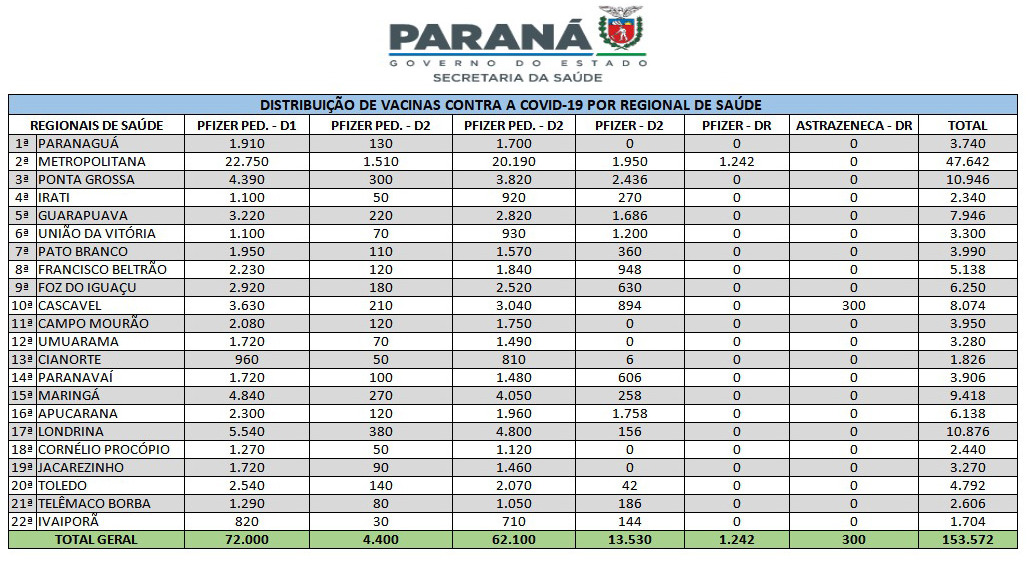 Para a segunda dose dos adolescentes estão sendo enviadas 13.530 vacinas da Pfizer. Já as doses de reforço (1.542) serão encaminhadas apenas para duas Regionais de Saúde. São 1.242 vacinas da Pfizer para a 2ª Regional Metropolitana e 300 doses da AstraZenca para a 10ª Regional de Cascavel.