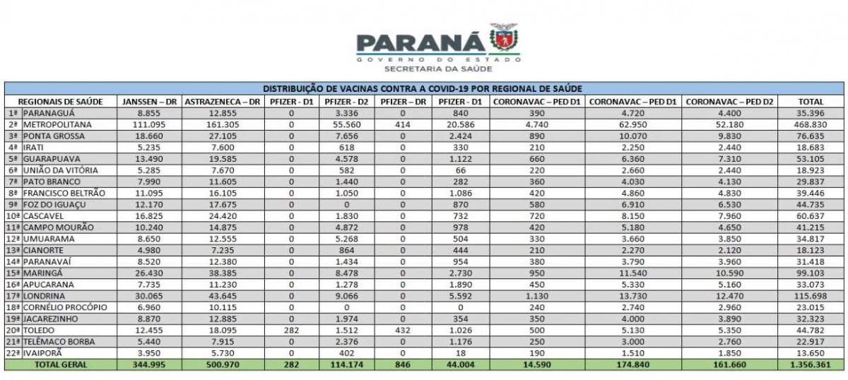 Confira a distribuição de doses enviadas nesta sexta-feira (25) por Regional de Saúde: