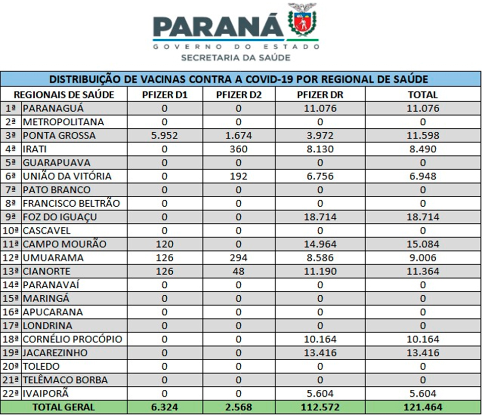 A Secretaria de Estado da Saúde (Sesa) distribuiu nesta segunda-feira (10), via terrestre, mais 121.464 vacinas contra a Covid-19. Os imunizantes da Pfizer/BioNTech são destinados à primeira dose (D1), segunda dose (D2) e dose de reforço (DR) e foram retirados do Centro de Medicamentos do Paraná (Cemepar) pelas Regionais de Saúde.