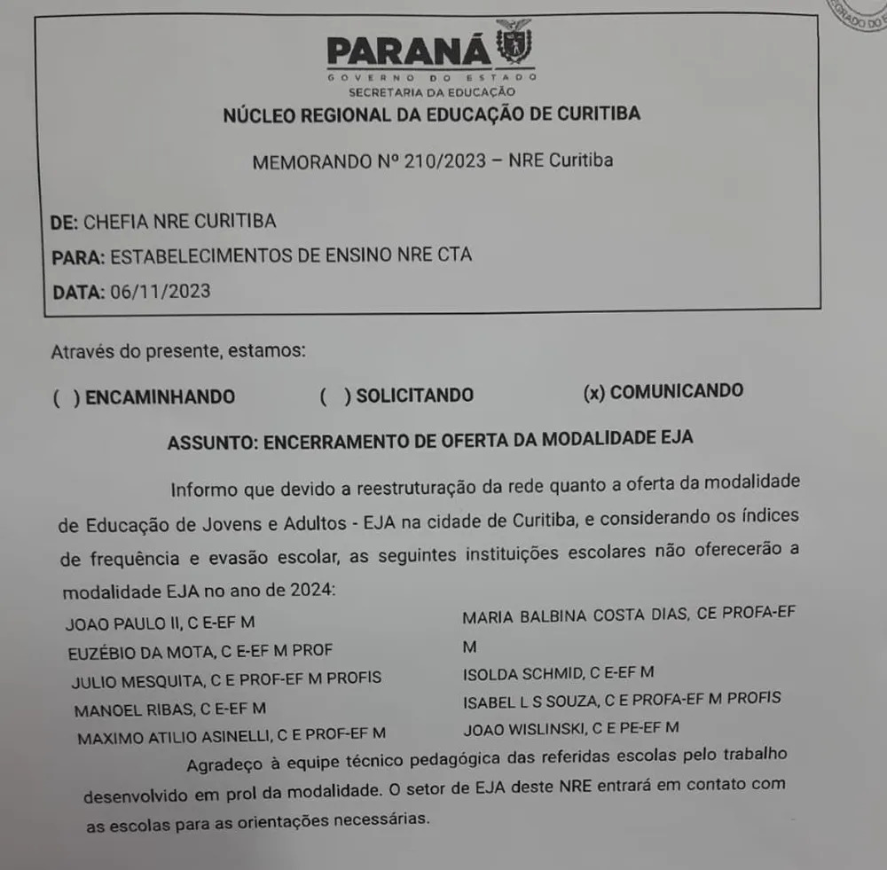 As informações foram prestadas pelo chefe do Departamento de Planejamento da Rede estadual de ensino, Gabriel Felipi de Araújo Silva, em entrevista nesta terça-feira (14) à RPC, após o Núcleo Regional de Educação (NRE) de Curitiba comunicar a direção de nove colégios estaduais da capital sobre o encerramento da EJA nas instituições.