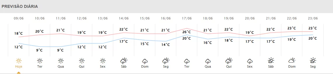 Toledo: Semana com predomínio de sol. Mínimas de 9 a 10ºC e máximas de 18 a 20ºC. Garoa leve no fim de semana.