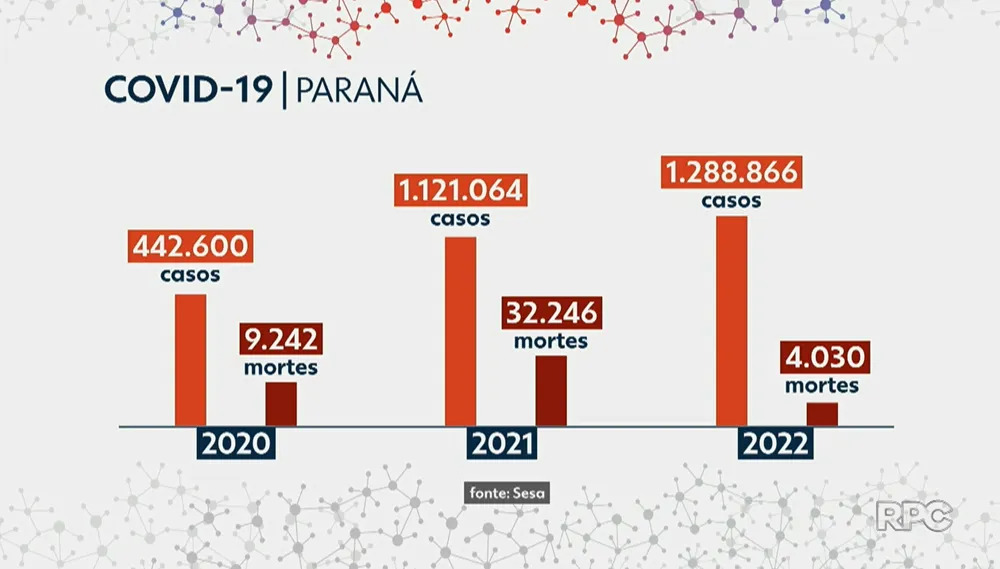 Desde o começo da pandemia, o Paraná confirmou 2.857.269 casos de Covid-19 e 45.528 mortes por conta da doença.
