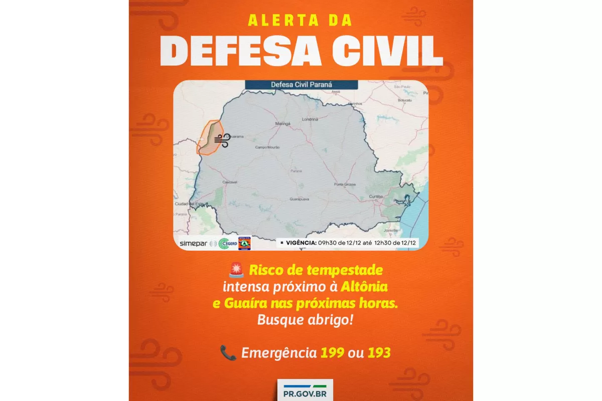 O Sistema de Tecnologia e Monitoramento Ambiental do Paraná (Simepar) e a Defesa Civil Estadual emitiram um alerta para a possibilidade de fortes tempestades nas regiões Oeste e Noroeste do Estado nesta sexta-feira (12). Os municípios de Altônia, Guaíra e cidades vizinhas devem concentrar a maior intensidade do fenômeno, com previsão de acumulados entre 80 e 120 milímetros de chuva no Oeste e de 50 a 80 milímetros no Noroeste.