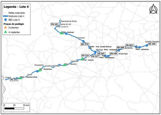 O lote 4 tem 627,52 quilômetros de extensão e abrange três rodovias federais (BR-272, BR-369 e BR-376) e oito estaduais (PR-182, PR-272, PR-317, PR-323, PR-444, PR-862, PR-897 e PR-986). O trecho passa pelas regiões Oeste, Noroeste e Norte do Paraná, conectando tanto a fronteira com o Paraguai, em Guaíra, até a divisa com São Paulo, em Nova Londrina.