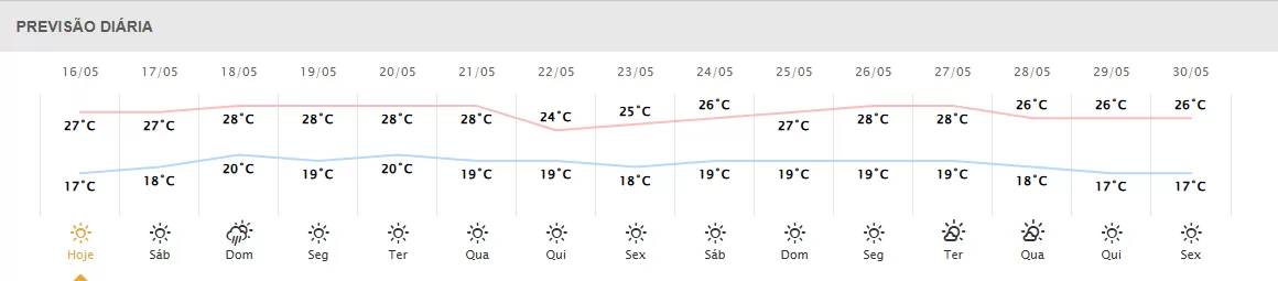 Foz do Iguaçu: mínima de 16°C e máxima de 28°C, com sol predominante e clima seco.