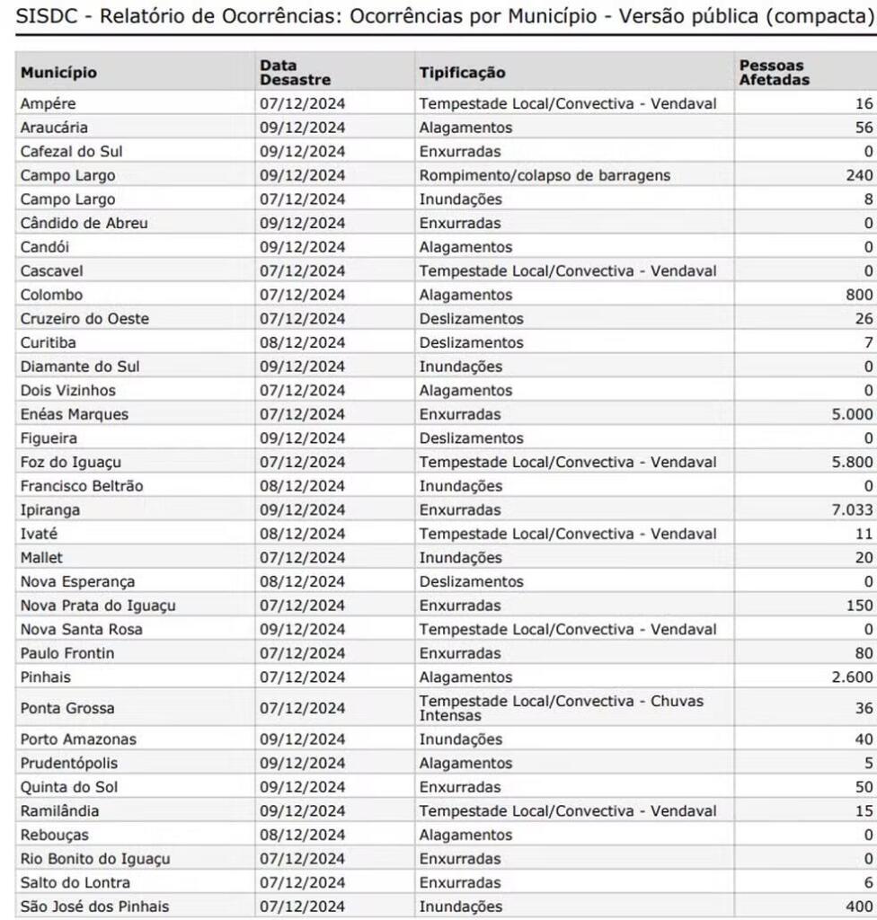 Os dados são do último boletim da Defesa Civil, atualizado às 11h50 desta terça-feira (10), e de informações apuradas pela RPC. O documento também informa que 407 pessoas ficaram desalojadas e 156 ficaram desabrigadas. Veja detalhes mais abaixo.