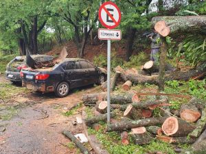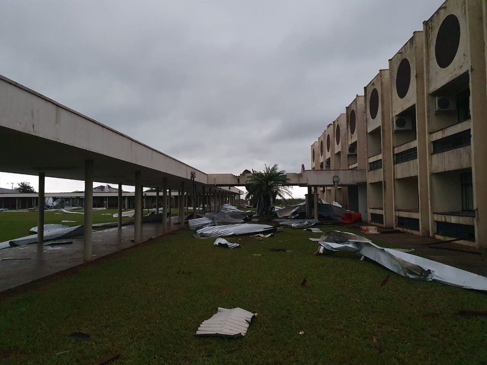 Chuvas e fortes ventos registrados neste sábado (23), em Foz do Iguaçu, derrubaram árvores e destruíram o telhado do prédio administrativo da Universidade Estadual do Oeste do estado (Unioeste).