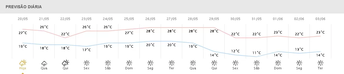 Cascavel: os termômetros devem oscilar entre 16°C e 30°C, com previsão de até 2,7 mm de chuva no período da tarde e ventos de até 41 km/h.