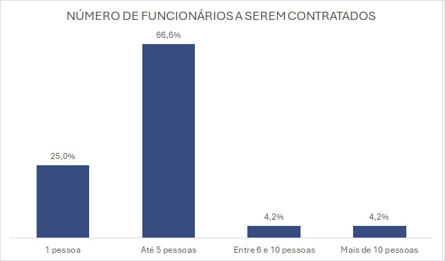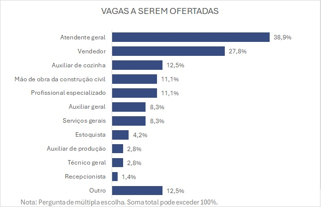 A maior parte das empresas, 66,6%, pretende contratar até cinco pessoas. As principais vagas a serem ofertadas são de atendente geral (38,9%), vendedor (27,8%), auxiliar de cozinha (12,5%), auxiliar geral (8,3%), profissional especializado (8,3%) e serviços gerais (8,3%). A Black Friday também aparece como um fator de estímulo, impulsionando 9,8% das contratações temporárias.