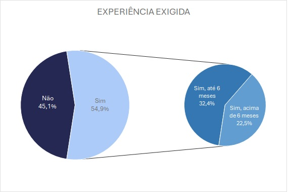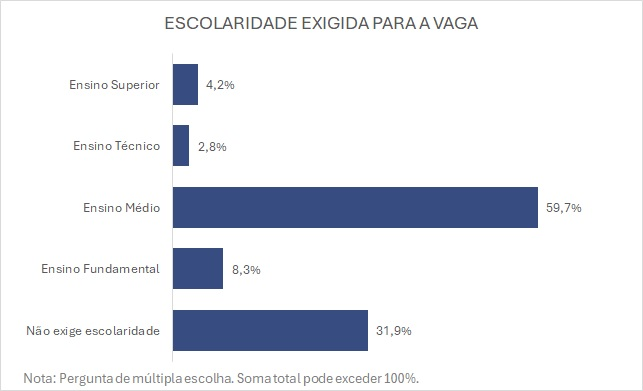 Quando se trata das qualificações exigidas, o Ensino Médio é o requisito predominante, solicitado em 59,7% das vagas. No entanto, 31,9% das oportunidades não exigem nenhuma escolaridade. Além disso, 54,9% das posições abertas pedem experiência prévia, sendo que 32,4% exigem até seis meses de prática na função, e 22,5% requerem mais de seis meses.