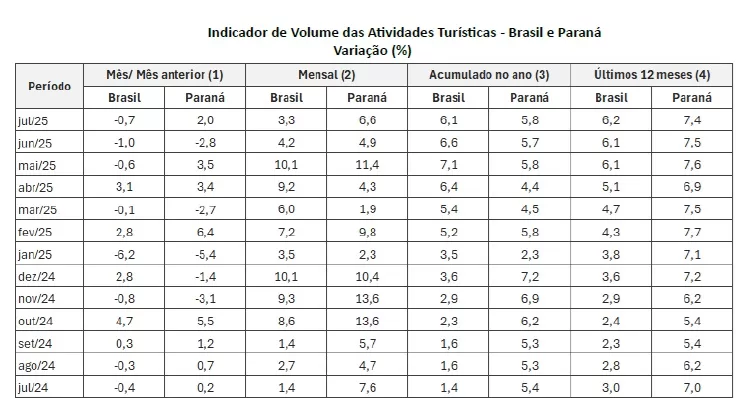 Na comparação com julho de 2024, o turismo paranaense avançou 6,6%, acima da média brasileira, de 3,3%. O resultado foi impulsionado, principalmente, pelas receitas de empresas de transporte aéreo de passageiros, serviços de bufê e reservas ligadas à hospedagem.