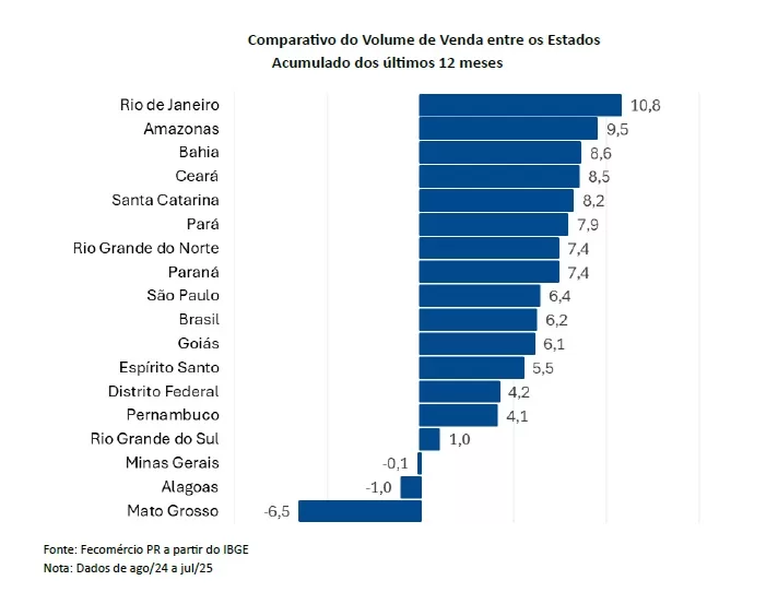No acumulado em 12 meses, o agregado especial das atividades turísticas teve expansão de 6,2% no Brasil frente igual período do ano anterior. No Paraná, o crescimento foi ainda maior, de 7,4%, o que coloca o estado na 8ª posição nacional, ao lado do Rio Grande do Norte.