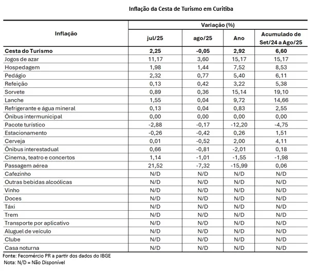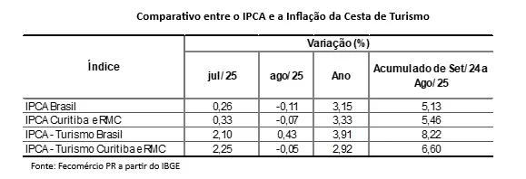 No acumulado de janeiro a agosto de 2025, a inflação do turismo em Curitiba e Região Metropolitana chegou a 2,92%, abaixo da média nacional, de 3,91%. Em 12 meses, a variação de preços foi de 6,60% na capital paranaense, também inferior ao índice brasileiro, que alcançou 8,22%.