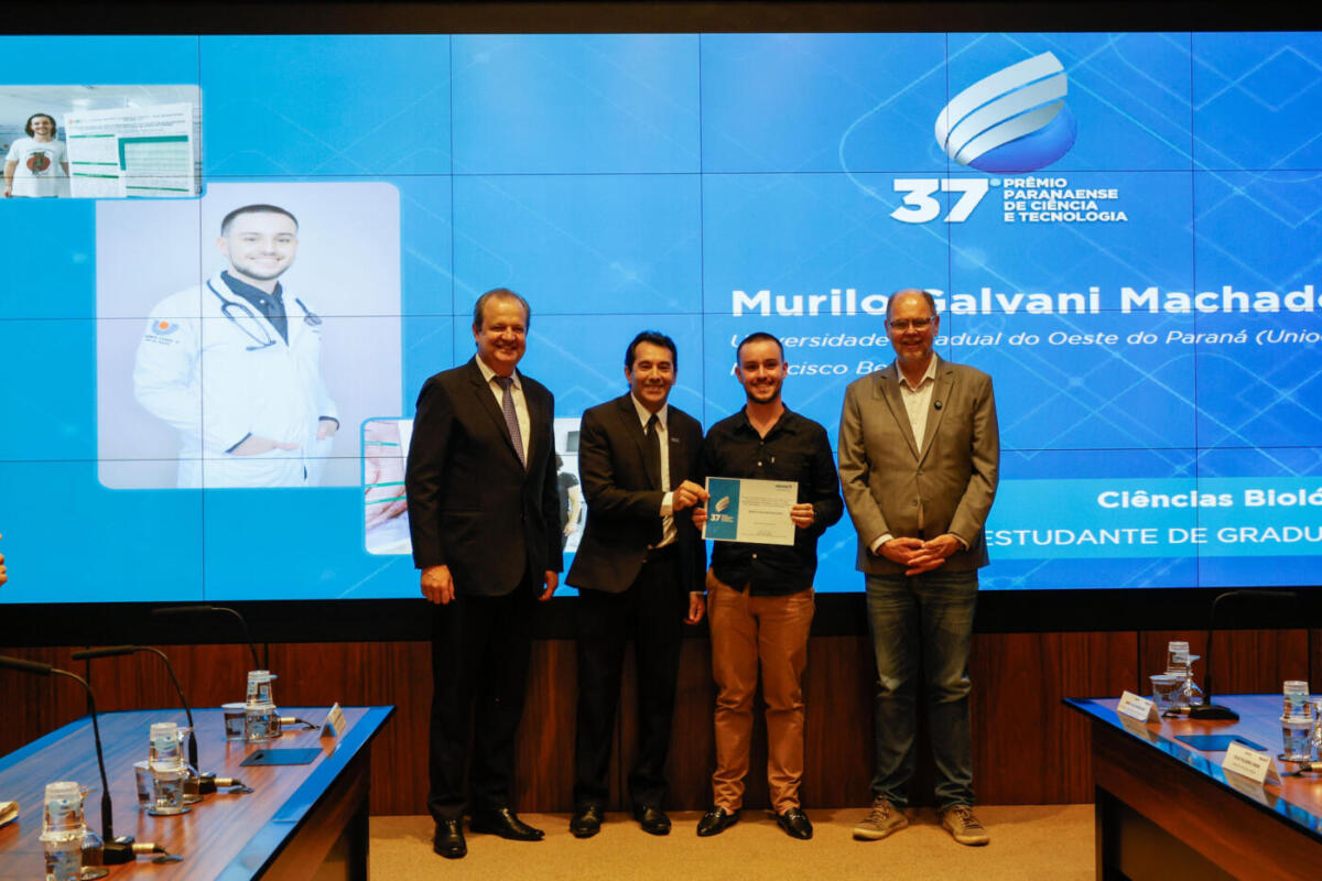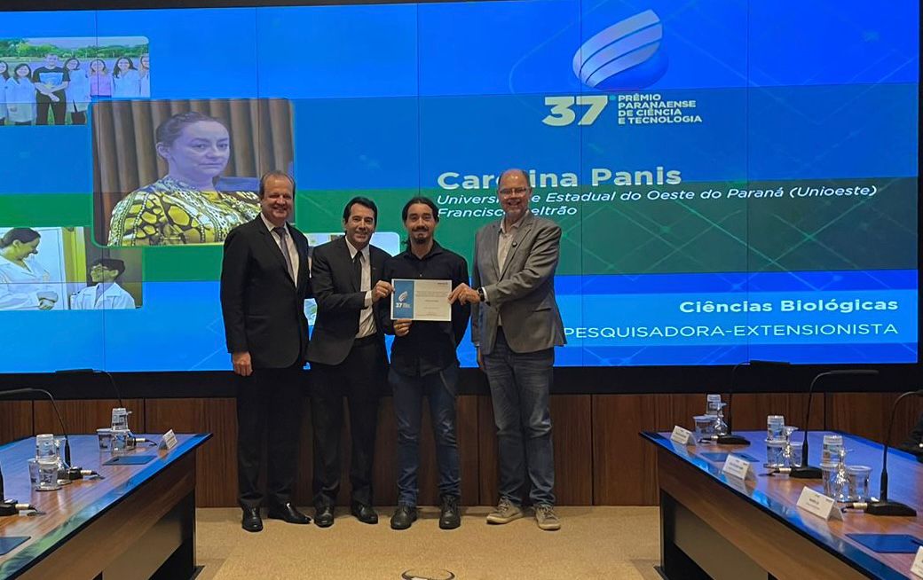 A docente do curso de Medicina da Universidade Estadual do Oeste do Paraná (Unioeste), campus de Francisco Beltrão, Carolina Panis e o estudante de graduação, Murilo Galvani Machado, foram premiados no 37º Prêmio Paranaense de Ciência e Tecnologia, que neste ano contemplou seis pesquisadores das áreas de Engenharia e Ciências Biológicas, entre professores universitários e estudantes da graduação, cerimônia que ocorreu nesta segunda-feira (25), no Palácio Iguaçu, em Curitiba.