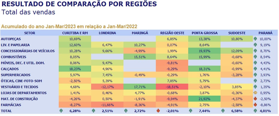 No trimestre, o comércio de Ponta Grossa apresentou o melhor resultado estadual, com crescimento de 7,44%. As vendas também tiveram elevação na região Sudoeste (6,58%), Curitiba e Região Metropolitana (6,28%), Maringá (2,72%) e Londrina (2,51%). Somente a região Oeste teve redução no período analisado, com baixa de 2,01%.