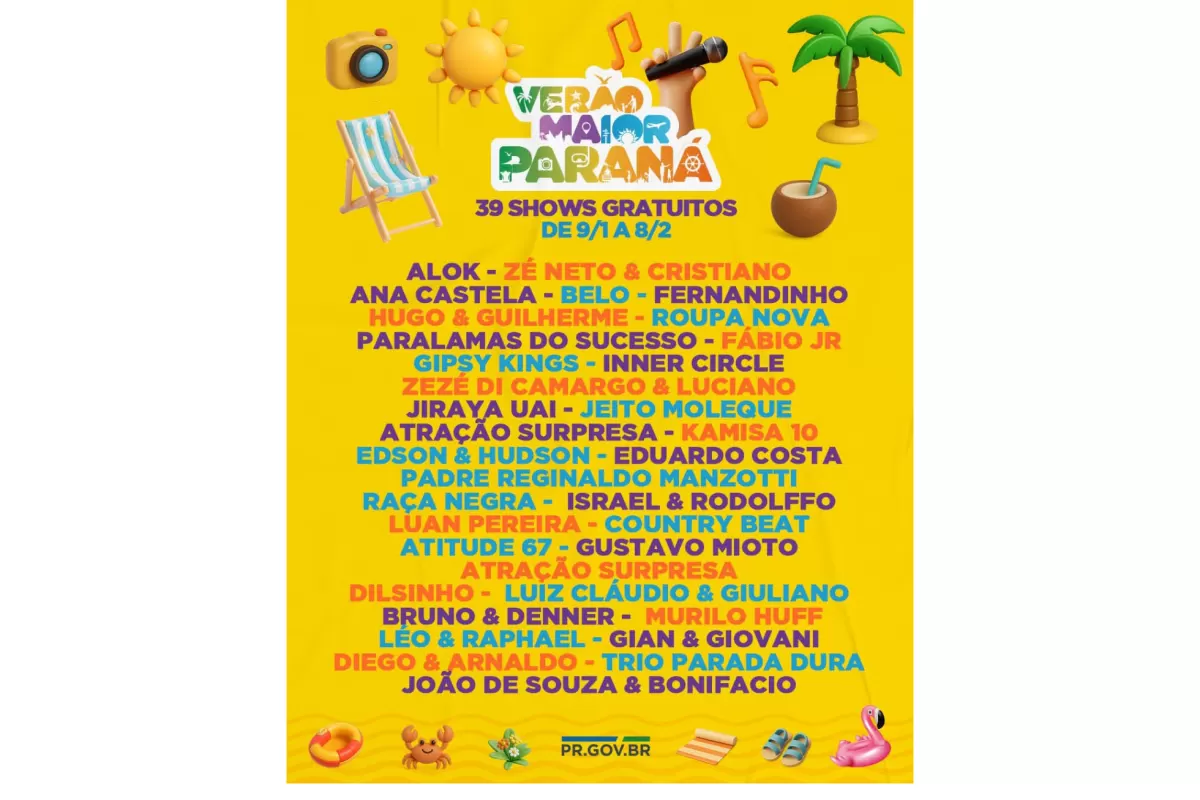 O Governo do Paraná anunciou nesta terça-feira (21) os nomes das atrações do Verão Maior Paraná 2026. São cinco finais de semana seguidos de espetáculos gratuitos, de nove de janeiro a oito de fevereiro. Entre as novidades estão shows nas quintas-feiras, atrações internacionais e palcos que devem ser maiores do que no ano passado. Os shows acontecerão nas praias de Matinhos e Pontal do Paraná e terão transmissão do SBT, Band, TVCI, Banda B e TV Paraná Turismo para todo o Brasil.