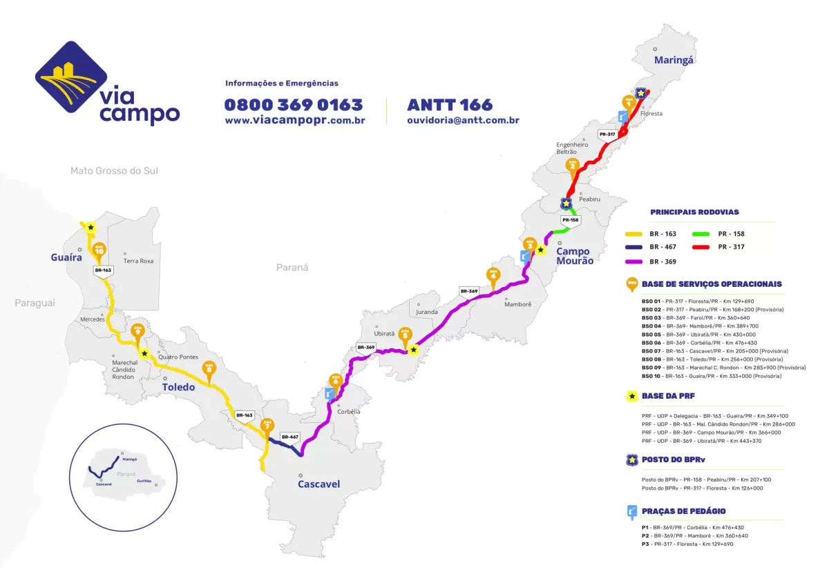 Essas vias conectam municípios estratégicos como Cascavel, Campo Mourão, Foz do Iguaçu, Ubiratã, Mamborê, Peabiru e Floresta, com papel central no transporte de cargas, especialmente do agronegócio e no deslocamento diário de milhares de usuários.