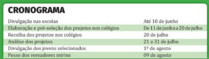 Cada colégio deve escolher no máximo cinco projetos para a seleção da Câmara Jovem. “São 15 colégios e devemos receber 75 projetos, dentre os quais vamos selecionar 16. No futuro talvez a gente evolua para uma eleição direta ou a eleição de um aluno por turma”, antecipa o vereador, salientando que os projetos serão recolhidos no dia 20 de julho nas escolas.