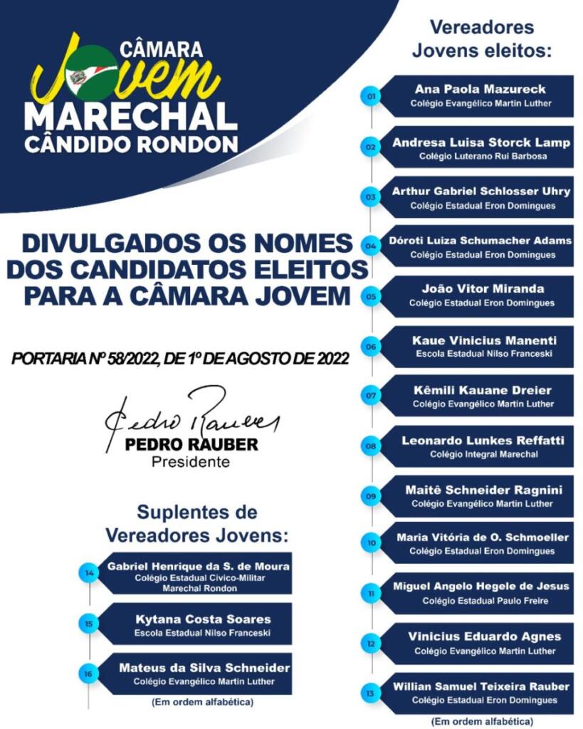 A Câmara de Vereadores de Marechal Cândido Rondon divulgou na segunda-feira (1º) os nomes dos 13 alunos titulares e dos três suplentes selecionados para comporem a nova Câmara Jovem, que será instalada no próximo dia 09.