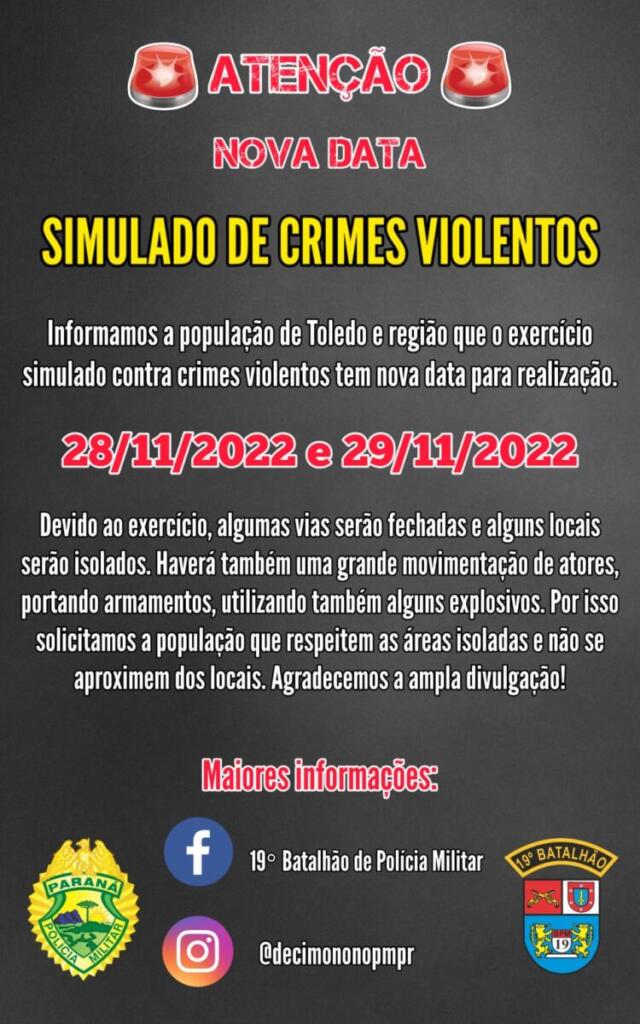 O 19º Batalhão da Polícia Militar informa a população de Toledo, São Pedro do Iguaçu e municípios vizinhos que na noite do dia 28 de novembro e madrugada do dia 29 de novembro (segunda-feira para terça-feira) ocorrerá um exercício simulado de combate a crimes violentos.