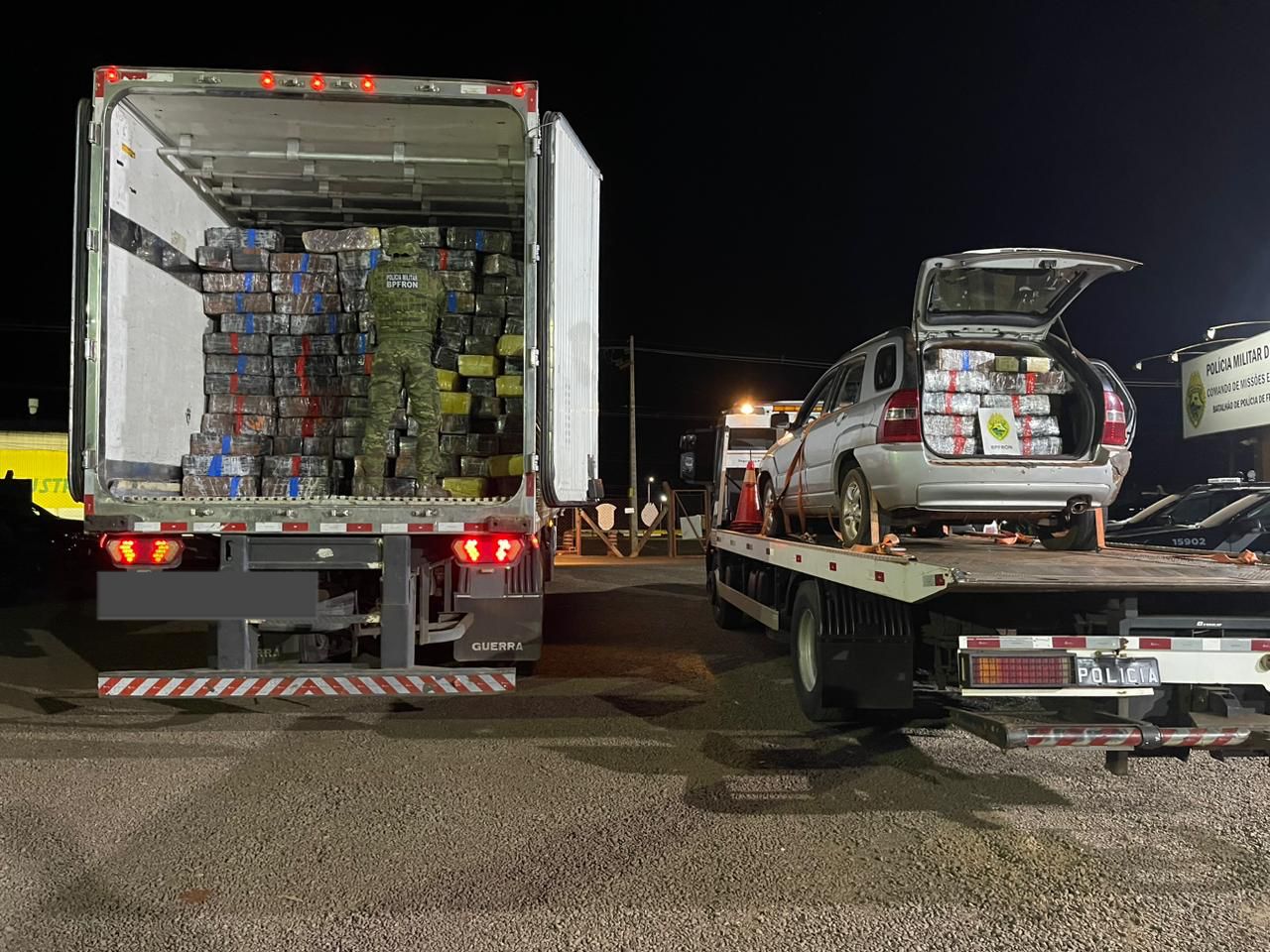 Ambos os veículos estavam carregados com 2,6 toneladas de substância análoga à maconha. Os veículos e a droga foram encaminhados para a delegacia da Polícia Federal em Cascavel-PR.